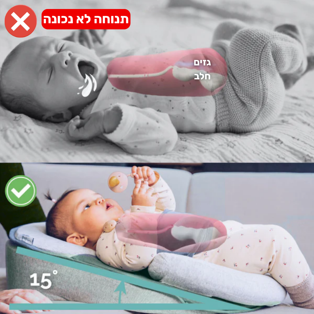 אבל כאן המיטה שלנו נכנסת לתמונה היא עוצבה במיוחד עם שיפוע של 15°, שמסייע לתינוק לעכל טוב יותר את האוכל בזמן השכיבה מה שמפחית את תחושת אי־הנוחות ועוזר למנוע פליטות מיותרות.
